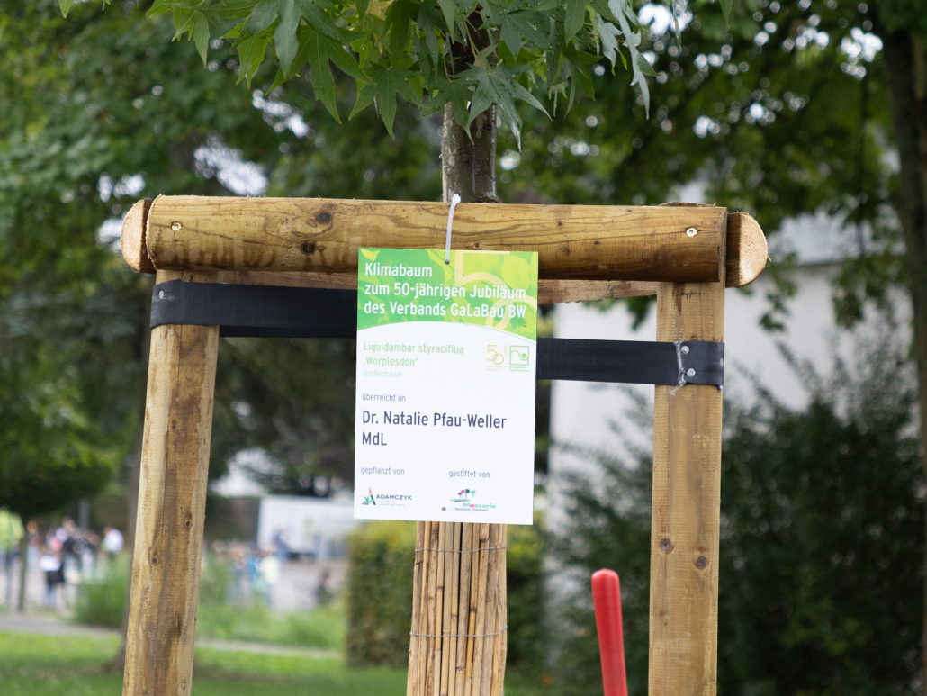 In ihrem Grußwort gratulierte Dr. Pfau-Weller dem Verband zum Jubiläum und würdigte dessen jahrzehntelanges Engagement für Qualität, Nachhaltigkeit und lebenswerte Grünräume. Ein besonderer Dank galt der Baumschule Messerle aus Hochdorf für die Baumspende sowie dem Garten- und Landschaftsbauunternehmen Dennis Adamczyk für die fachgerechte Pflanzung.
