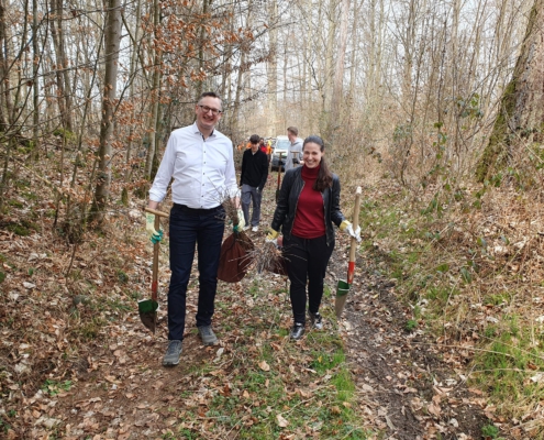 Zusammen mit den Teckwerken, deren Mitgliedern und der JU Kirchheim haben die Kirchheimer Landtagsabgeordneten unter fachkundiger Anleitung von Forst BW Laubbäume gepflanzt.